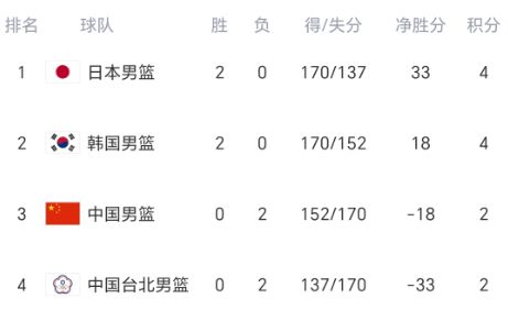 随着日本+韩国开局2连胜,世预赛最新积分榜:中国男篮庆幸非垫底