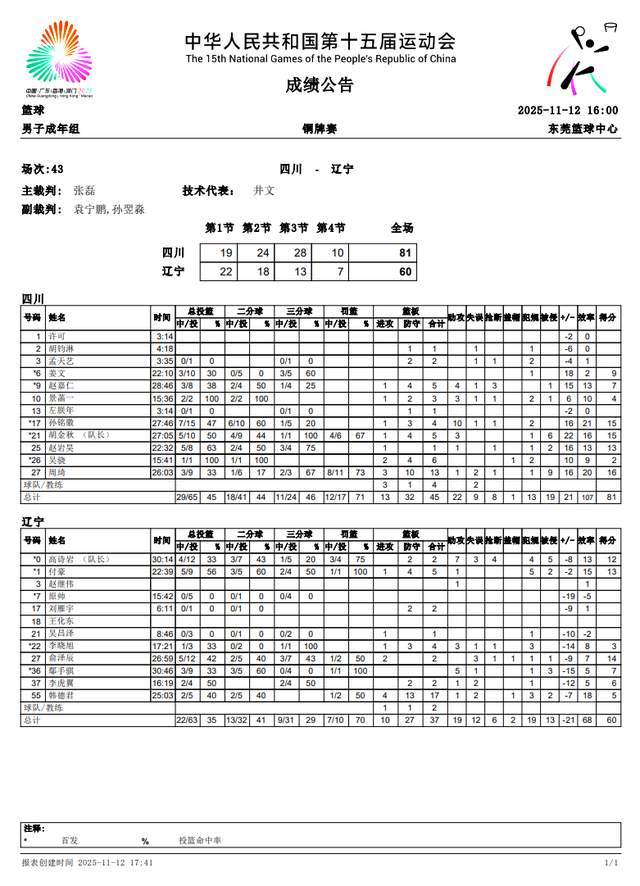 60-81!辽宁全运男篮终究未能站上领奖台,在铜牌争夺战中,以21分之差,输给了四川全运男篮,屈居第4名,四川队则是拿到了铜牌。周琦面对辽宁队真不手软,拿下16分13篮板。韩德君最后一舞,只拿到5分17篮板。