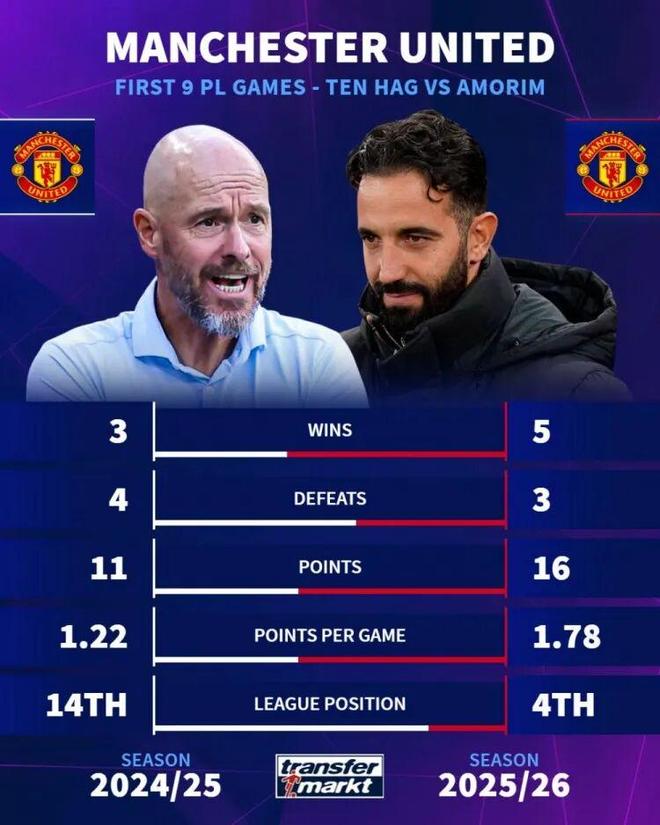 随着球队再度取胜,曼联主帅阿莫林的天也彻底亮了!执教曼联的前33场英超比赛从未取得过连胜,如今带队取得三连胜直接让球迷直呼:“曼联终于好起来了”,而更令人欣喜的是,一看积分榜,曼联竟然以16分一跃升至联赛积分榜第四!与之对比,上赛季前9轮,滕哈格麾下的曼联仅以3胜2平4负积11分排在联赛第14。