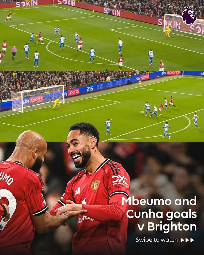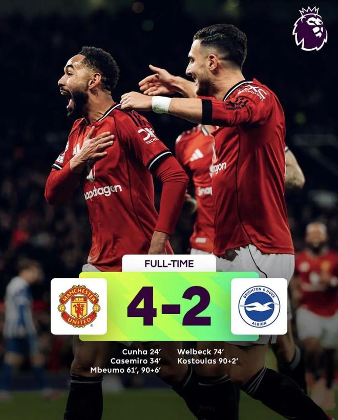 2025年10月26日 曼联4-2布莱顿取三连胜 姆伯莫双响卡塞米罗传射库尼亚破门