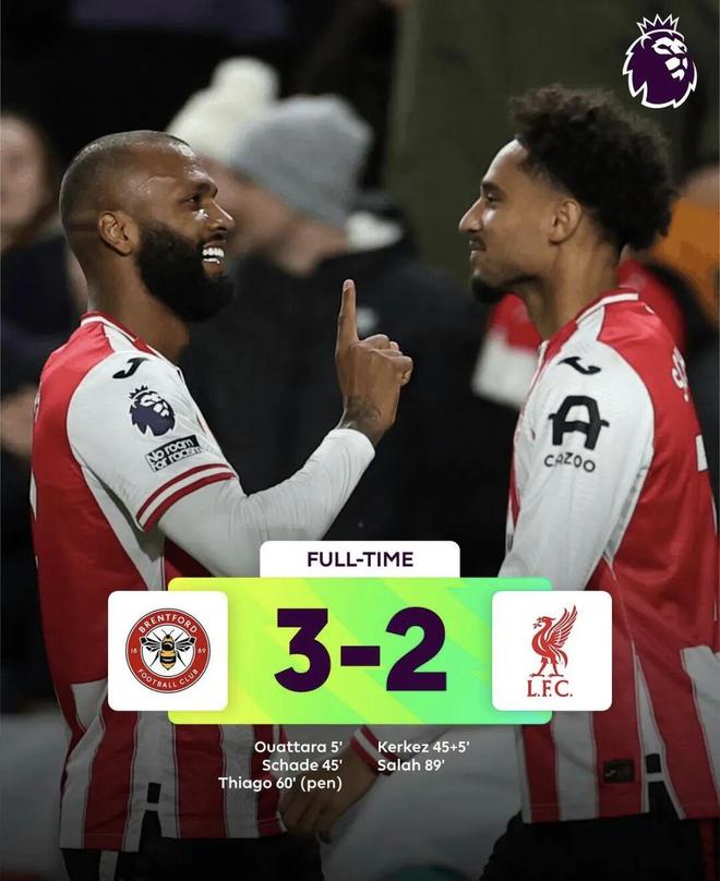 这个比赛日最晚进行的比赛中,利物浦依旧未能扭转颓势,2-3不敌布伦特福德遭遇联赛四连败!少赛一轮的情况下,与伯恩茅斯同积15分,但因为净胜球劣势排在第6!看来这个赛季开始后连续绝杀的债,“红军”依然在还......