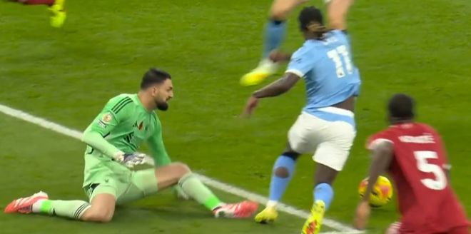 比赛的第8分钟,利物浦后卫失误,多库禁区内断球突破被马马达什维利绊倒,主裁判回看慢镜头之后判罚点球,哈兰德主罚点球,被马马达什维利飞身封出。